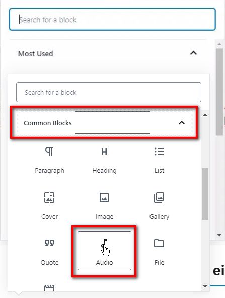 Wie bei Bildern einen neuen Block einfügen und dann auf Audio klicken, und dann Datei hochladen (sofern man einen bezahlten Website hat). Ansonsten URL auswählen und externen Link einfügen.