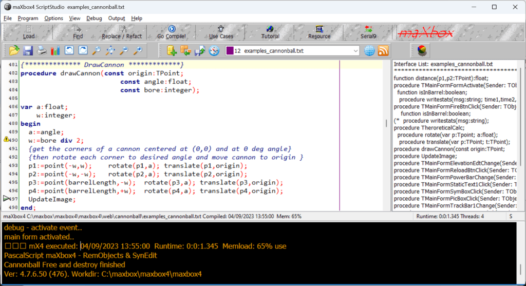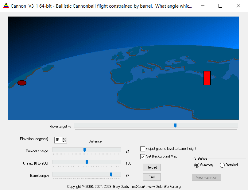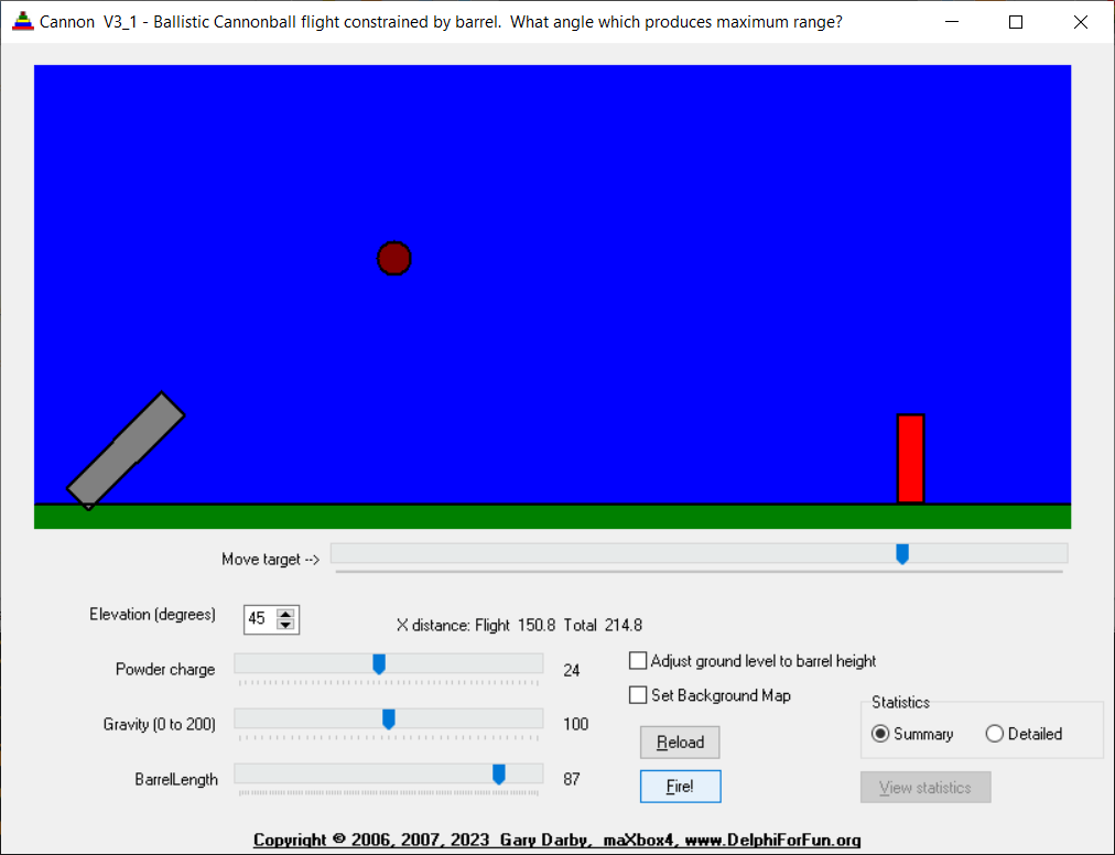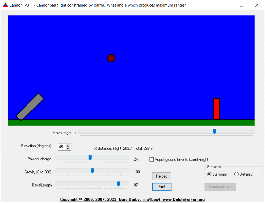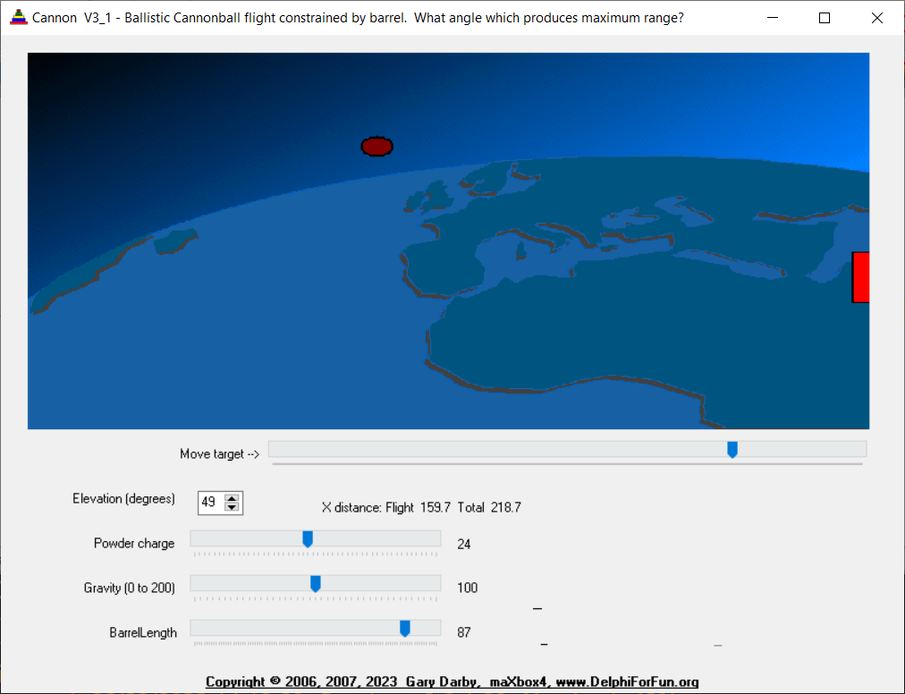 Here’s an animated graphics program that builds on the bouncing ball program by adding some horizontal movement to the ball, drawing a primitive cannon that you can aim, a target that can be moved and an adjustable powder charge to give the initial push to the ball. Cannonball is also the project-name of the 64bit migration from maXbox4 to maXbox5.