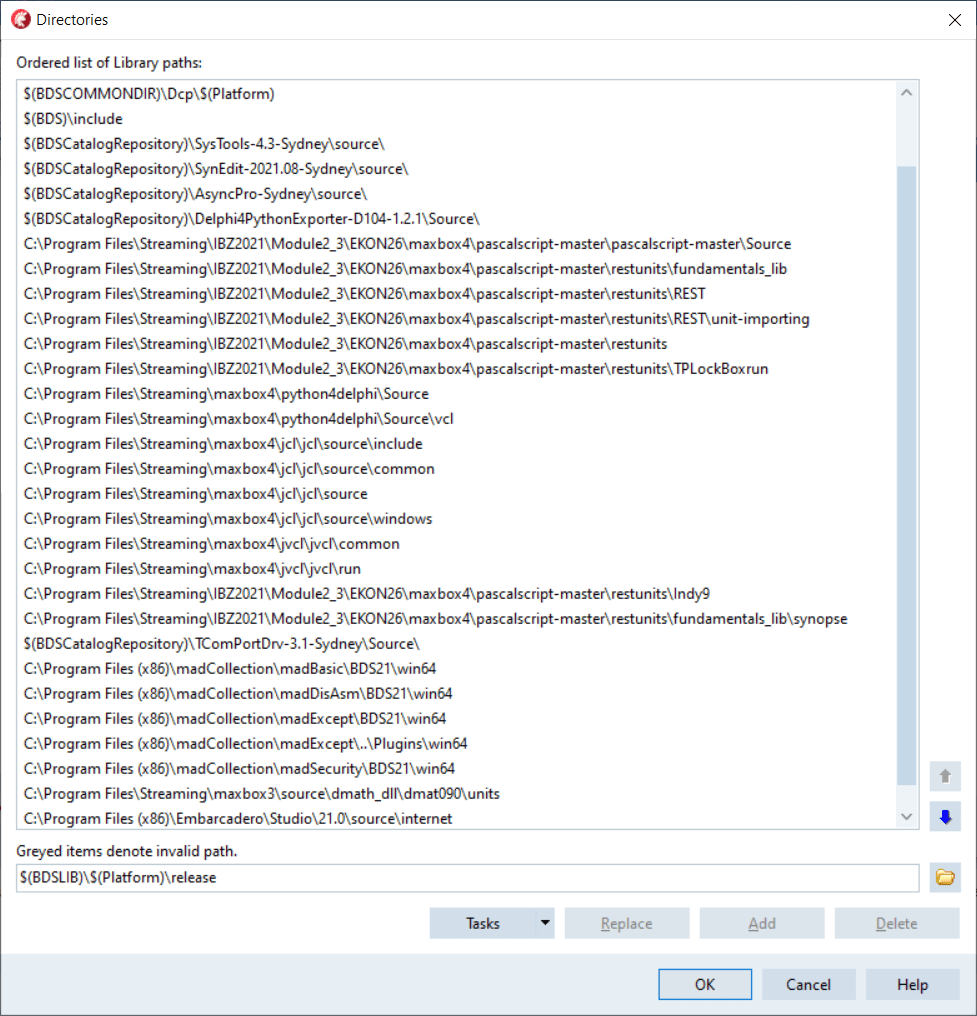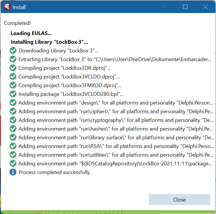 d:\lockBox3\runand all the subdirectories) to the IDE’s library path. For C++Builder, add the hpp subdirectory (e.g.,d:\lockBox3\source\hpp\Win32\Release) to the IDE’s system include path. - Open & install the designtime package specific to the IDE being used. The IDE should notify you the components have been installed.