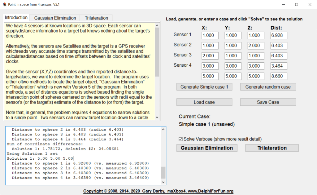 An Example to compare 32- and 64-bit: We have sensors at known locations in 3D space. Each sensor can supply distance information to a target but knows nothing about the target’s direction. Alternatively, the sensors are Satellites and the target is a GPS receiver which reads very accurate time stamps transmitted by the satellites and calculates distances based on time offsets between its clock when a clock time message is received and satellites’ clock time when the message was sent (as contained in the message).