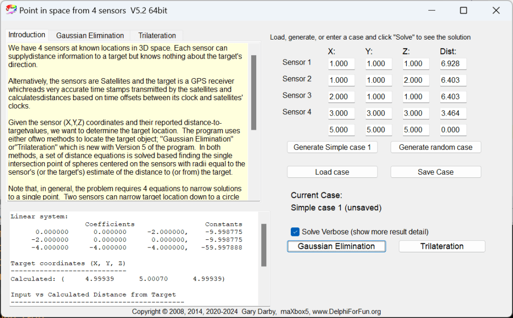 Version 5 posted today adds a second method for locating the target. Trilateration uses the locations of three sensors to exactly narrow the target location down to at most two possibilities. See this Wikipedia article for an excellent discussion and derivation of the Math involved. I translated a C code implementation to Delphi for testing.